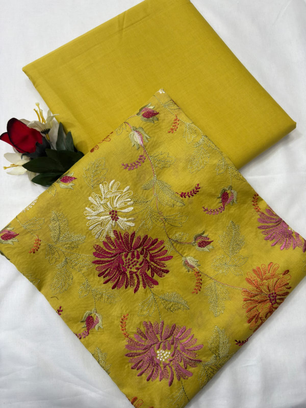 Shop the elegant Mustard Flora 2-Piece Suit from Rupas Collection. Premium lawn fabric featuring intricate silk floral embroidery. Only 2600 PKR. Flash Deal: Buy 3 suits and get 10% OFF! Fast shipping available.