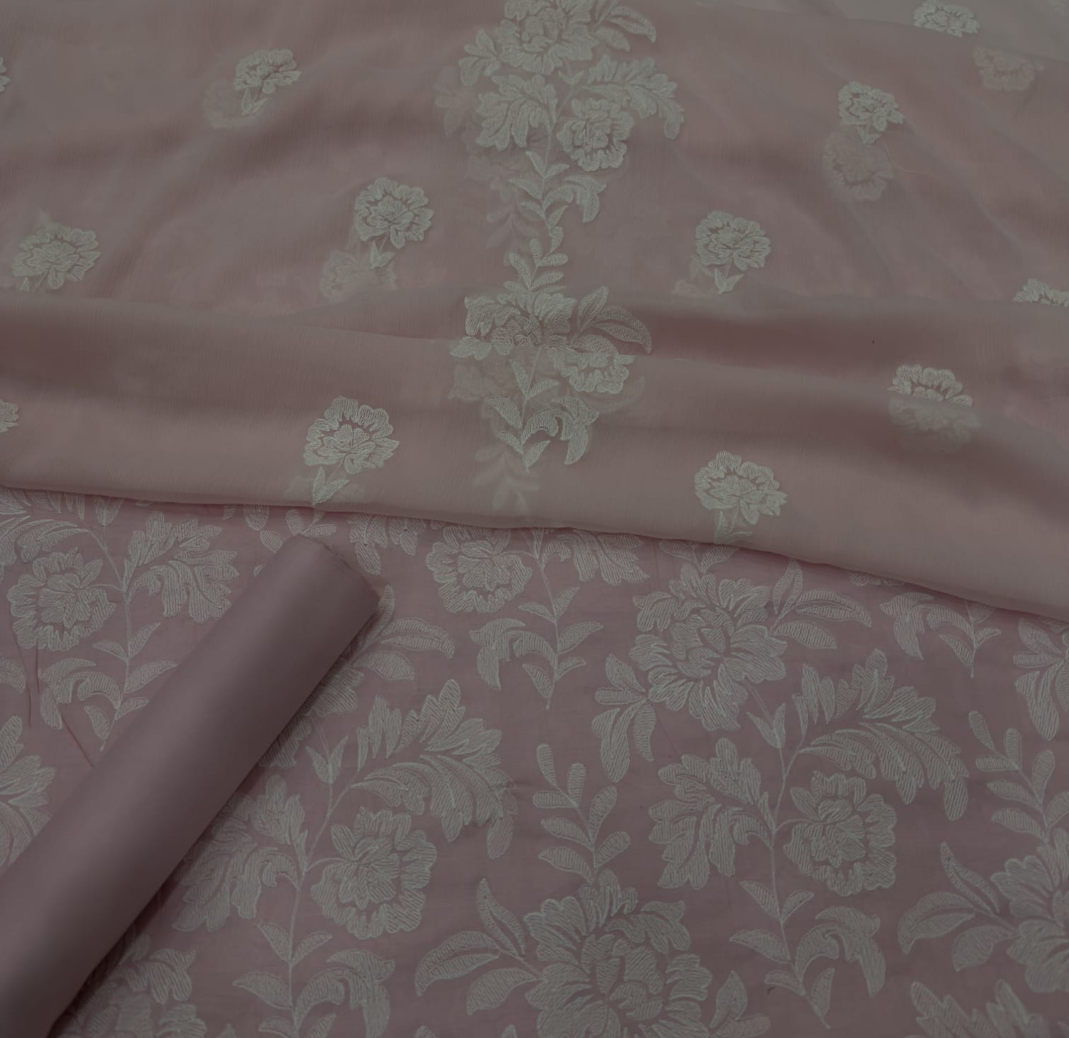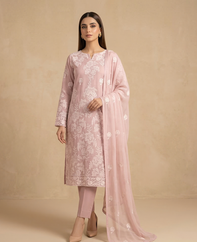 Premium Dusty Pink 3-Piece Pure Embroidered Lawn Suit With Matching Safon Dupatta & Plain Trouser