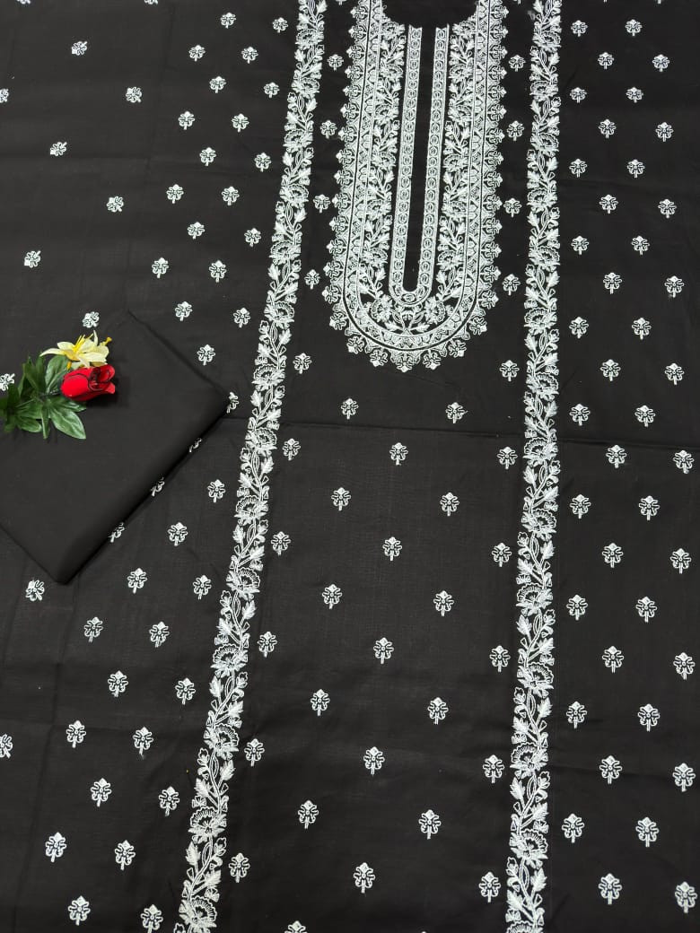 Shop the stunning Noir Elegance 2-Piece Suit from RupasCollection. Crafted from premium, breathable lawn fabric, this ensemble features exquisite white silk-style floral embroidery set against a deep black canvas. The intricate vertical vine patterns and detailed neckline create a slimming, sophisticated silhouette that transitions perfectly from daytime chic to evening grace.