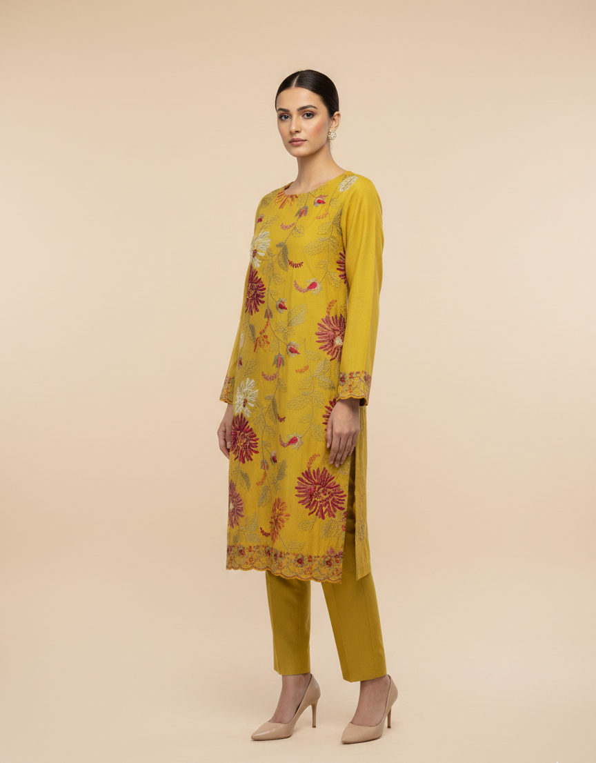 Shop the elegant Mustard Flora 2-Piece Suit from Rupas Collection. Premium lawn fabric featuring intricate silk floral embroidery. Only 2600 PKR. Flash Deal: Buy 3 suits and get 10% OFF! Fast shipping available.