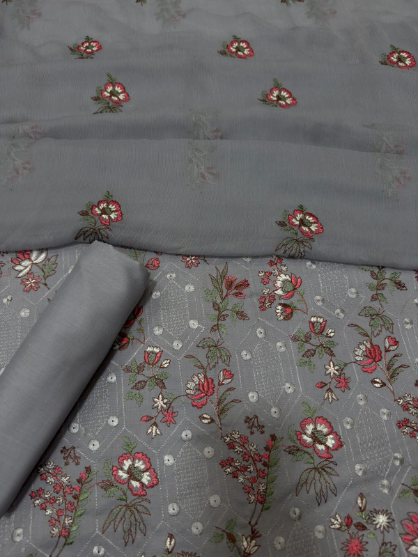 Premium Ash Grey 3-Piece Pure Embroidered Lawn Suit With Matching Safon Dupatta & Plain Trouser