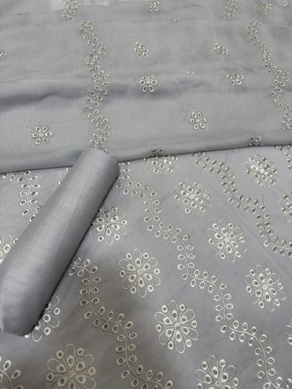 Premium Dusty Blue 3-Piece Pure Embroidered Lawn Suit With Matching Safon Dupatta & Plain Trouser