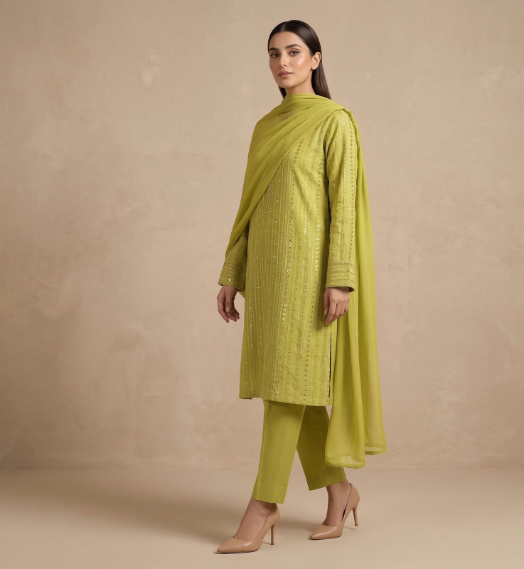 Premium Vibrant Chartreuse 3-Piece Pure Embroidered Lawn Suit With Matching Safon Dupatta & Plain Trouser
